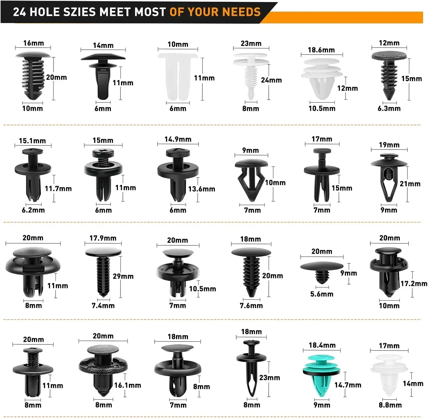 Compatible with a wide range of vehicles—including GM, Ford, Lexus, Honda, Chrysler, Mazda, Nissan, and Jeep—this universal kit is perfect for DIY repairs, replacements, and professional automotive maintenance. The barbed design allows easy installation while preventing loosening, making panel, bumper, and trim repairs quick and reliable.