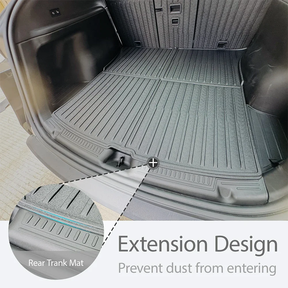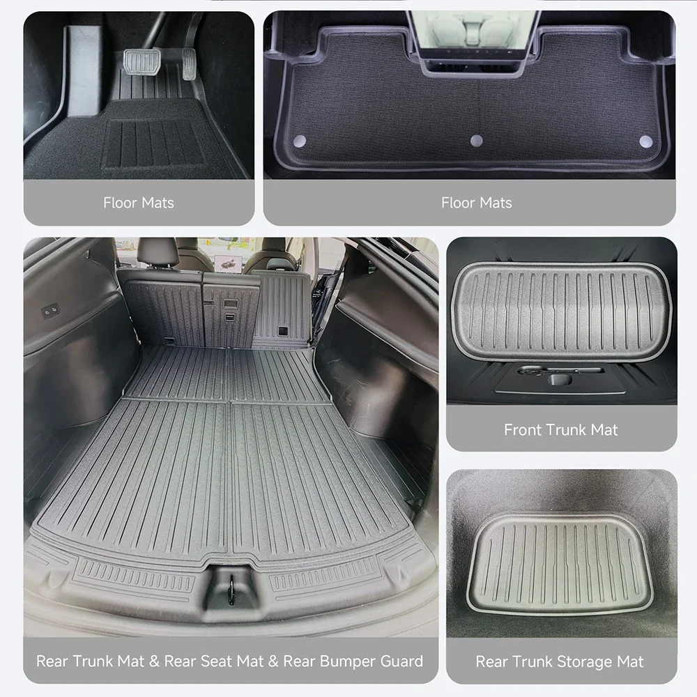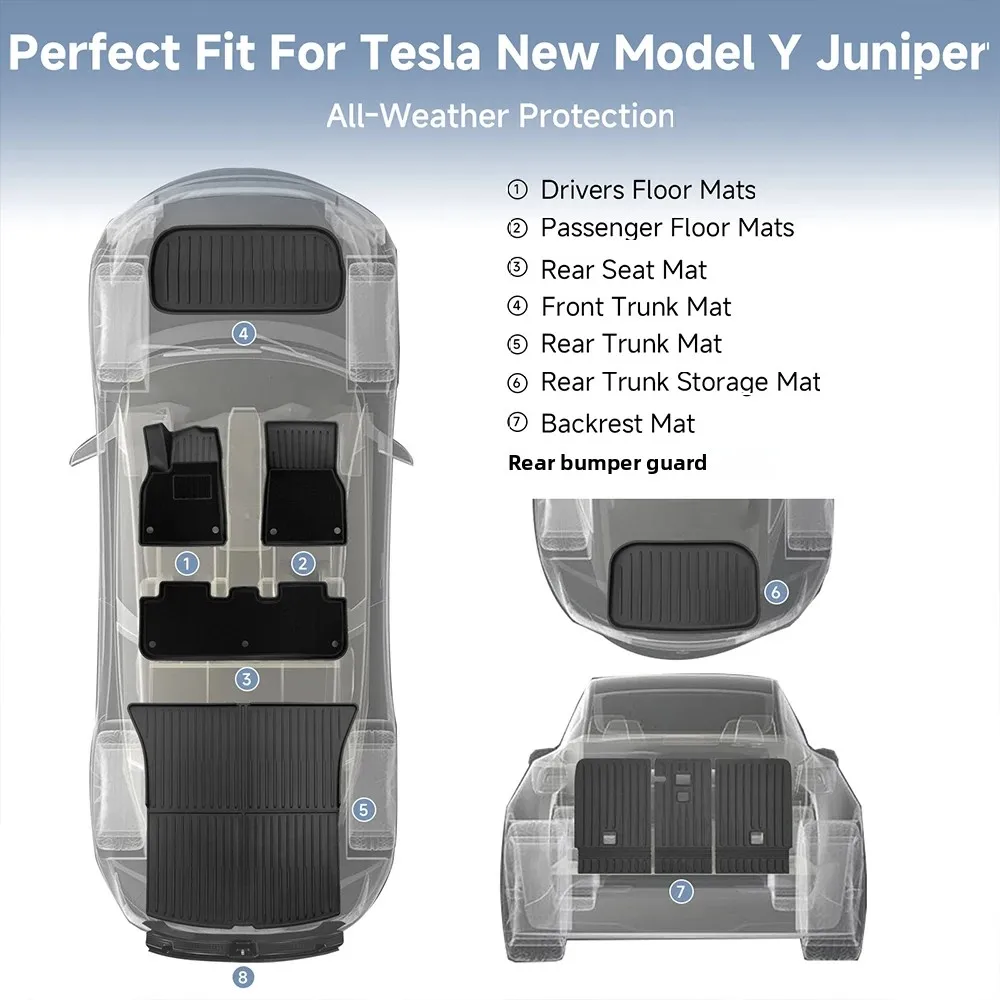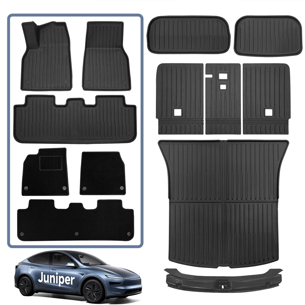 These TPE floor mats are specially designed for the Tesla Model Y Juniper 2025–2026. They combine durable TPE material with carpet layers for enhanced comfort and protection. The waterproof surface helps guard against spills, mud, and moisture. Custom-fit design ensures precise coverage for the vehicle interior. The set includes a matching cargo liner for full trunk protection. All-weather construction makes the mats suitable for year-round use. Non-slip backing keeps the mats securely in place while driving. They help protect original flooring from dirt, wear, and damage. The mats are easy to remove and clean for convenient maintenance. An essential Tesla accessory for maintaining a clean and stylish interior.